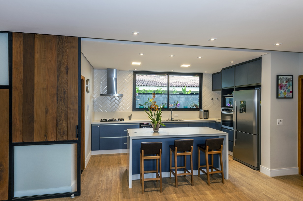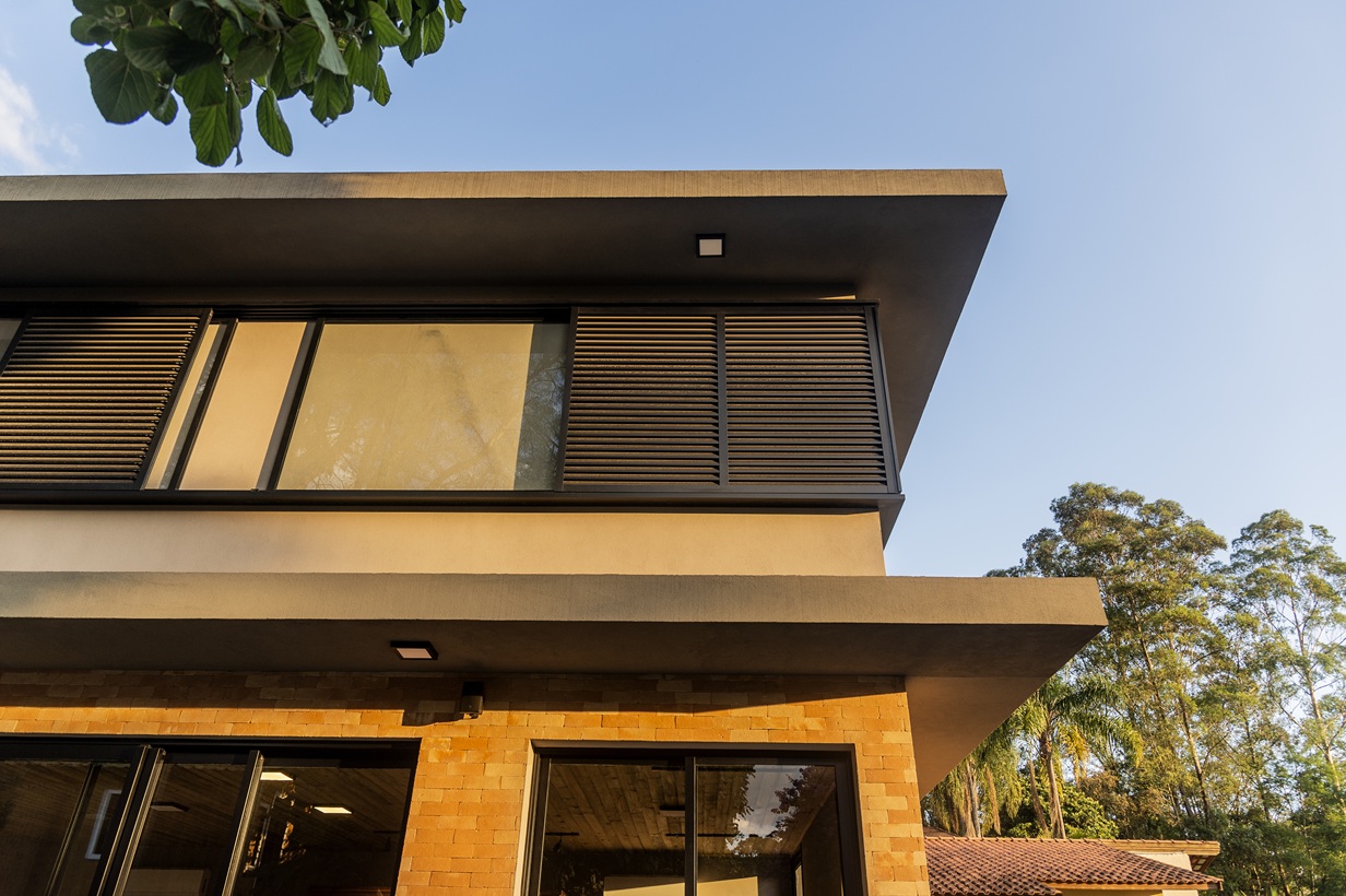 A área íntima da casa, com dormitórios conectados por um corredor com armários planejados, foi projetada para promover a união familiar. As três suítes são verdadeiros refúgios, com camas amplas janelas com vista para o jardim trazendo vivacidade.
