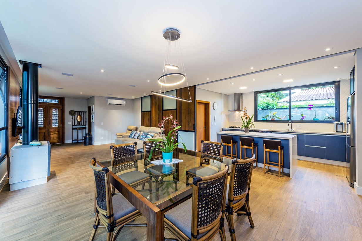 O andar térreo abriga um espaço gourmet pensado para a praticidade e o convívio. Uma extensa estante de madeira exibe uma variedade de bebidas, complementando a cozinha equipada com bancada espaçosa e banquetas. A robusta mesa de jantar em madeira, com confortáveis assentos estofados, é o cenário perfeito para refeições memoráveis. Um forno de pizza e um fogão a lenha adicionam um toque rústico e charmoso ao ambiente.
