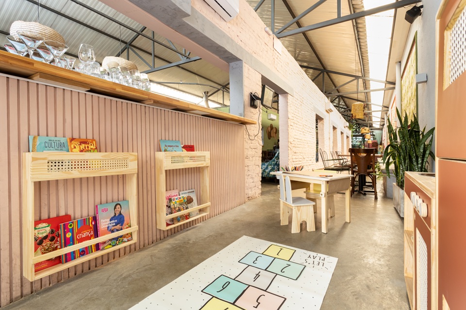 Na mesma linha, o Quincho, em Pinheiros, comandado pela chef Mari Sciotti, também incorporou uma brinquedoteca ao seu projeto. Desenvolvido em colaboração com a Muskinha e o escritório Fabular, o espaço parte da perspectiva infantil para definir materiais, proporções e usos. Elementos naturais, texturas táteis e propostas abertas de brincadeira criam um ambiente que estimula criatividade e independência, enquanto os adultos desfrutam da experiência gastronômica.