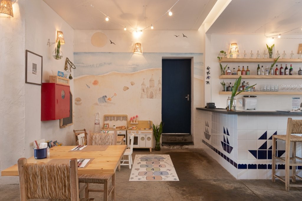 Um dos exemplos mais recentes é o MULI, em Santa Cecília, que inaugurou uma brinquedoteca em parceria com a marca de mobiliário infantil Muskinha. Idealizado pela arquiteta Isabel Nassif, o espaço nasce de uma vivência real: a maternidade da fundadora. O resultado é um ambiente que valoriza o brincar livre, com mobiliário na escala das crianças, estímulo à autonomia e uma estética que conversa com o restante do restaurante — sem rupturas visuais.