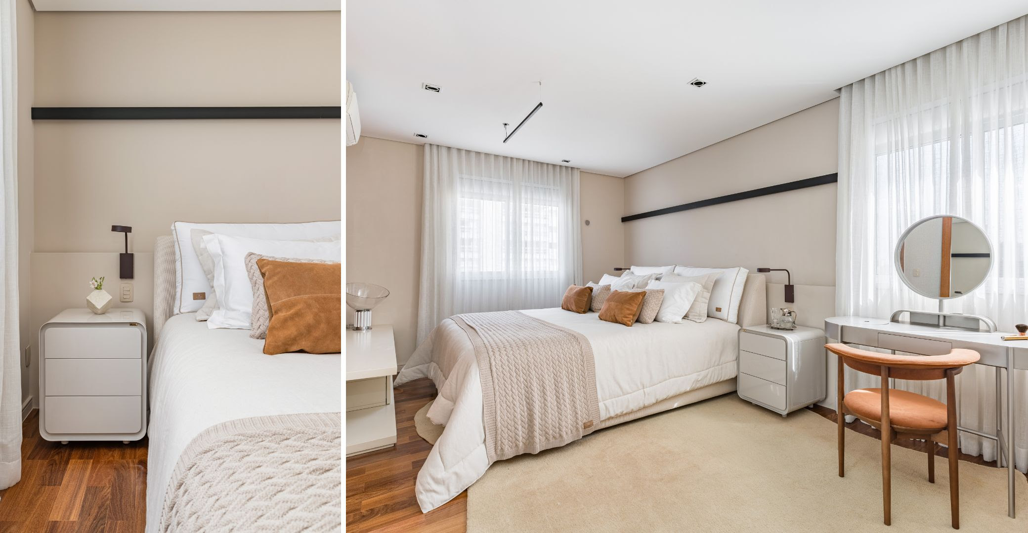 Já na suíte principal, o foco foi o bem-estar. O layout redesenhado permitiu a inclusão de uma penteadeira em área bem iluminada, além de uma cama mais ampla e uma cabeceira acolhedora. A iluminação indireta, com sistema dimerizável, cria um clima de refúgio e relaxamento, essencial para a rotina da moradora.