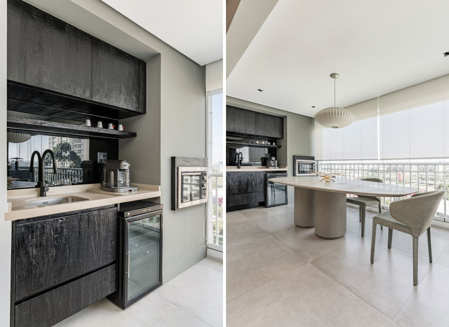 Sem quebra-quebra, o projeto aposta em soluções inteligentes para renovar o visual. Entre os destaques está a aplicação de revestimento preto autoadesivo sobre a marcenaria existente e a pintura da madeira de demolição na varanda. As escolhas atualizam o apartamento com sofisticação e praticidade, reforçando uma linguagem contemporânea que valoriza o que já existia.