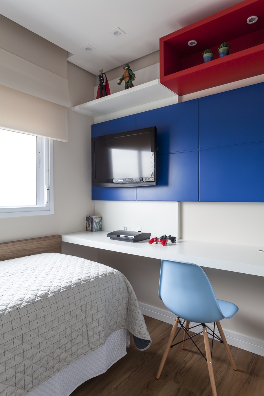 Os dormitórios das crianças refletem a individualidade de cada um, com tons de azul e amarelo em um e a combinação de vermelho e azul em outro. O quarto do casal segue um estilo clássico, com paleta neutra, papel de parede perolado e móveis sob medida que unem elegância e praticidade.