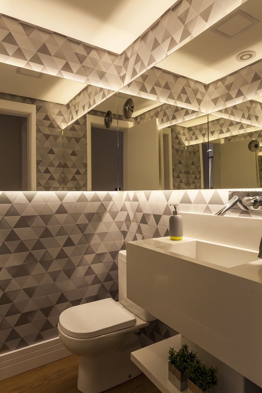 Nos banheiros, revestimentos texturizados complementam o estilo geral da casa. O lavabo, por sua vez, surpreende com um papel de parede geométrico colorido e um espelho em L, criando um ambiente despojado e original.