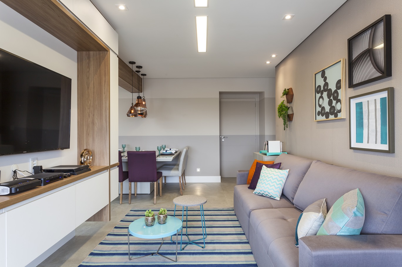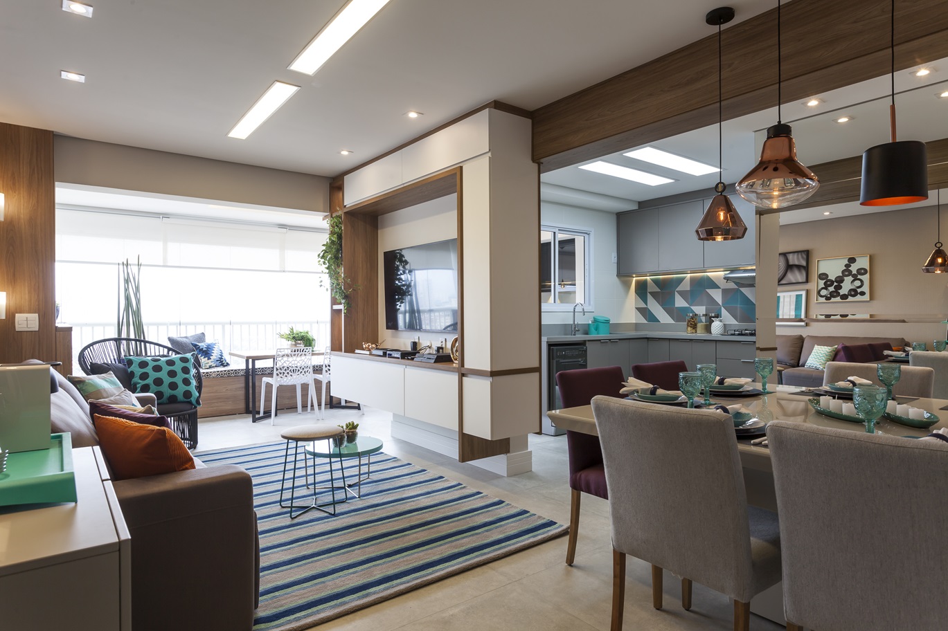 A varanda gourmet foi integrada à sala, expandindo a área de convivência e criando um espaço perfeito para receber amigos e familiares. No living, a marcenaria personalizada equilibra funcionalidade e leveza visual. Tons neutros predominam, com toques de cor e revestimentos que adicionam sofisticação e descontração. Um tapete listrado sob medida e um sofá confortável reforçam a sensação de acolhimento.