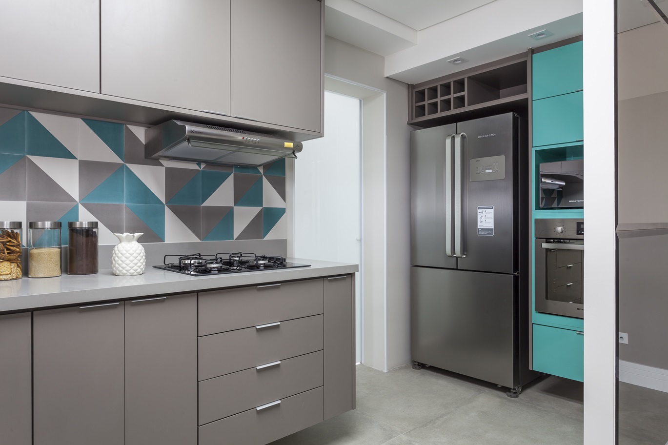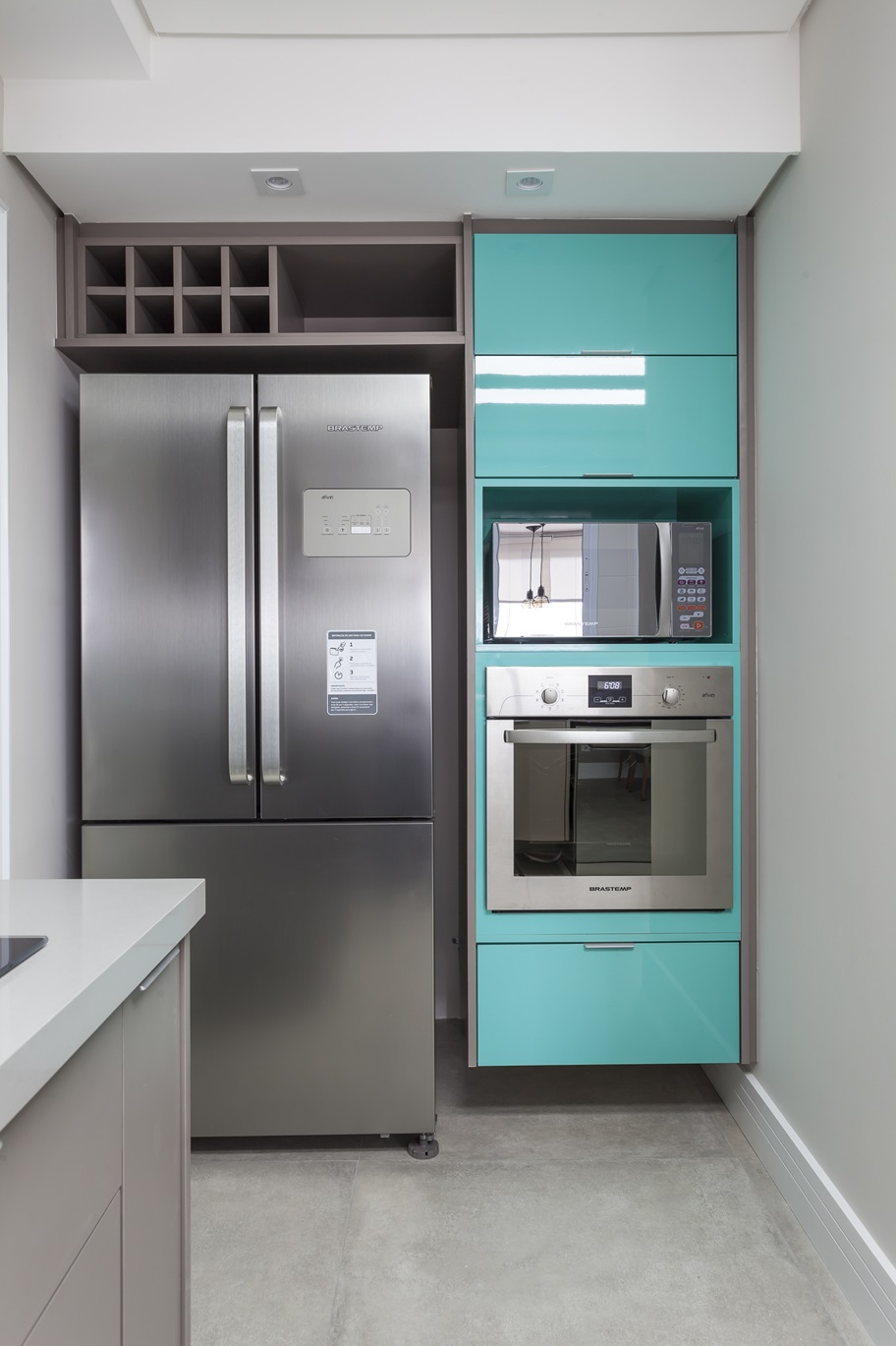 A cozinha se destaca pelo contraste vibrante e contemporâneo, com cores escolhidas pelos moradores que refletem sua personalidade. Armários planejados para organização eficiente e nichos abertos para vinhos agregam funcionalidade e charme.