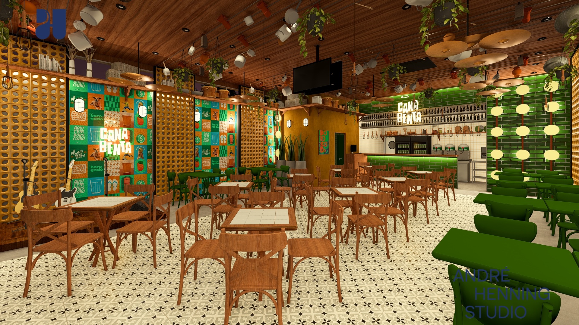 - Bar CanaBenta (Samba e Pagode): O clássico da boemia curitibana, Bar CanaBenta, celebra o samba e o pagode com soluções que misturam memória afetiva e funcionalidade. As luminárias instaladas em pandeiros, desenhadas exclusivamente para o espaço, são um exemplo primoroso de como a arte e a iluminação se unem. O piso de ladrilho hidráulico não só remete à tradição brasileira, como também oferece durabilidade e fácil manutenção. Os cobogós amarelos, que evocam a década de 1970, e as grades de ferro completam a estética de uma casa brasileira típica, oferecendo divisões de ambiente sem perder a ventilação e a iluminação. “É um projeto que fala de memória afetiva e que celebra o nosso cotidiano com humor e identidade”, destaca André Henning.