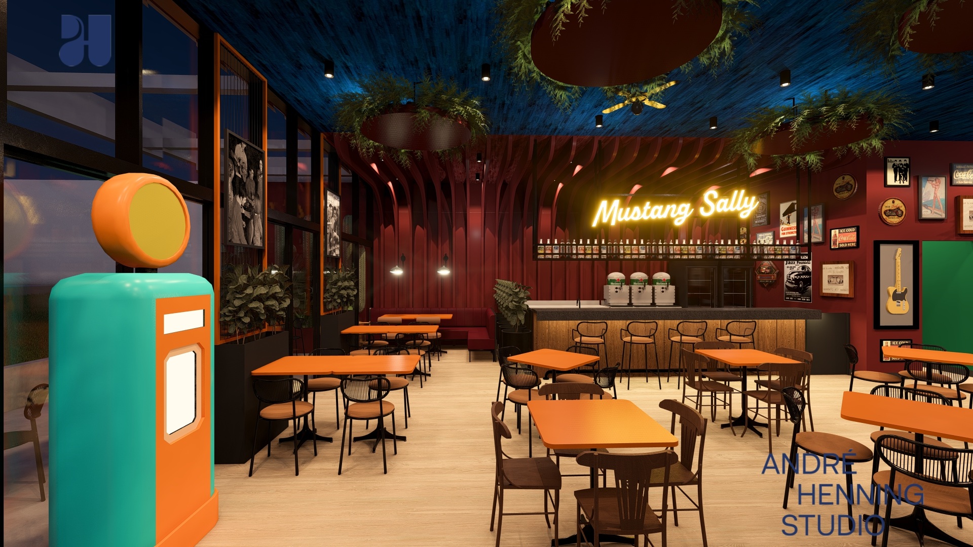 - Mustang Sally (Tex-Mex e Rock’n’Roll): O universo tex-mex e do rock’n’roll, característico do Mustang Sally, é traduzido por meio de uma paleta de cores fortes e o uso estratégico de elementos metálicos. A abundância de curvas no mobiliário e na estrutura remete ao dinamismo do rock, enquanto as referências ao emblemático diner norte-americano evocam a nostalgia e a informalidade, tudo isso com a praticidade de um ambiente que suporta grande fluxo de pessoas.