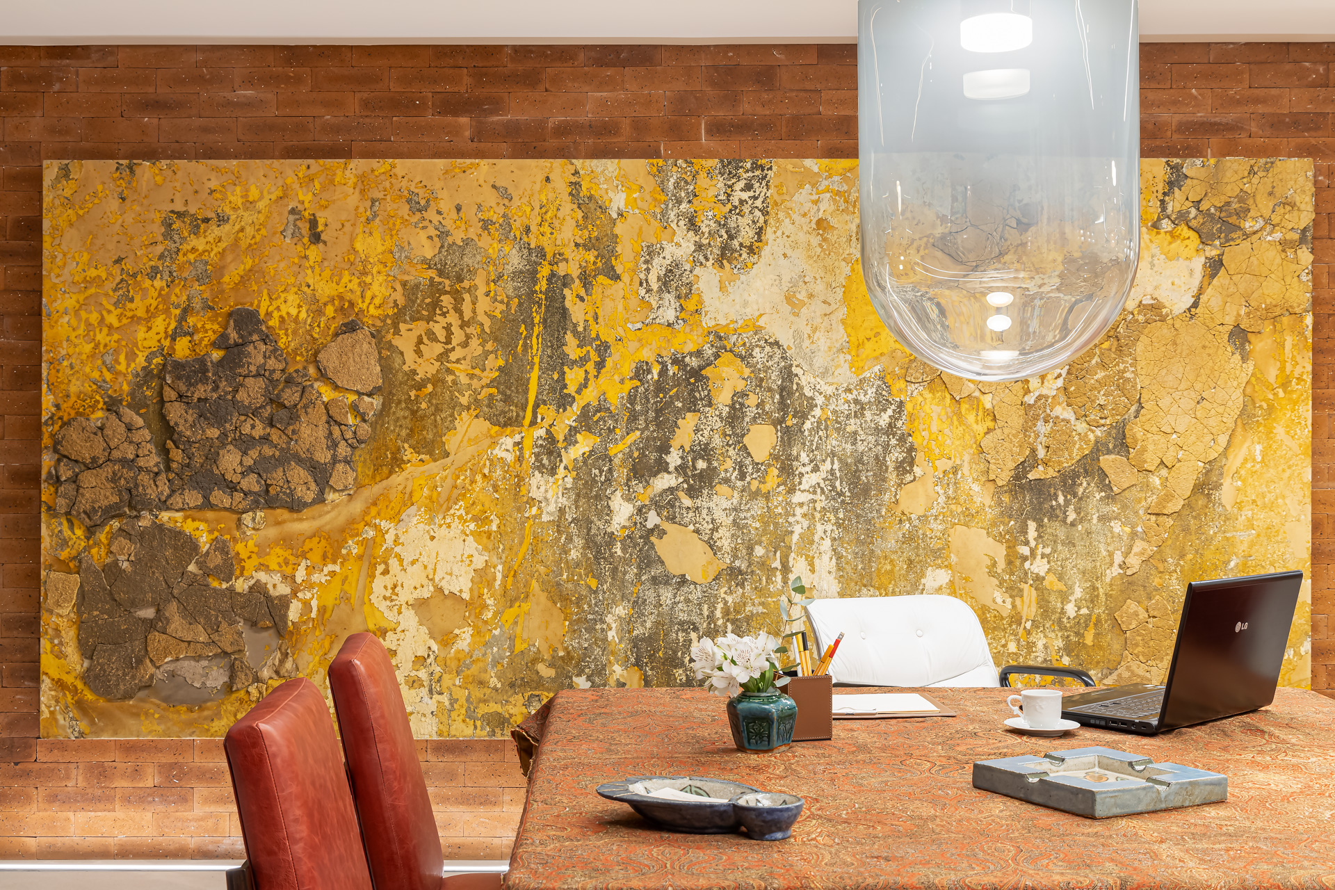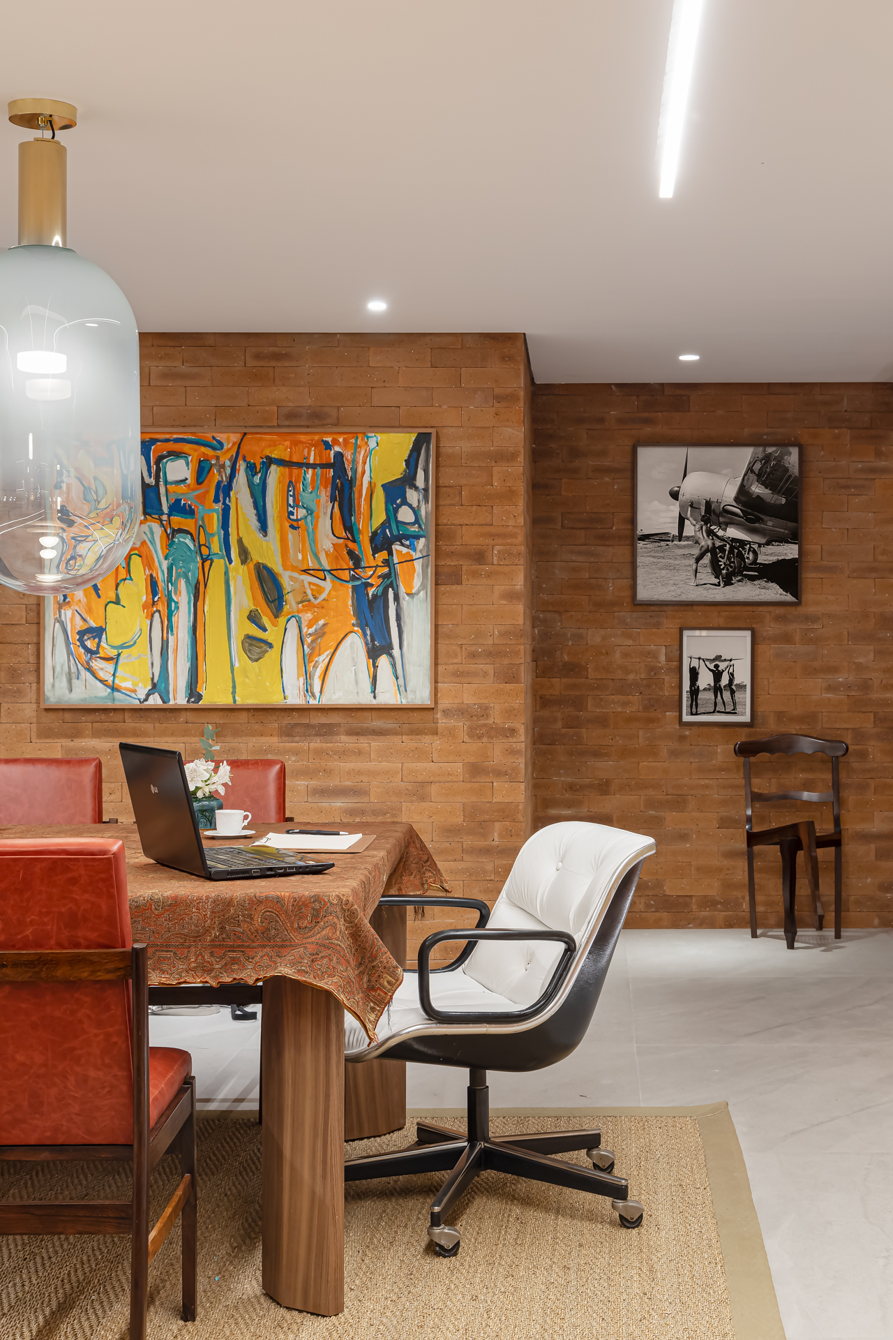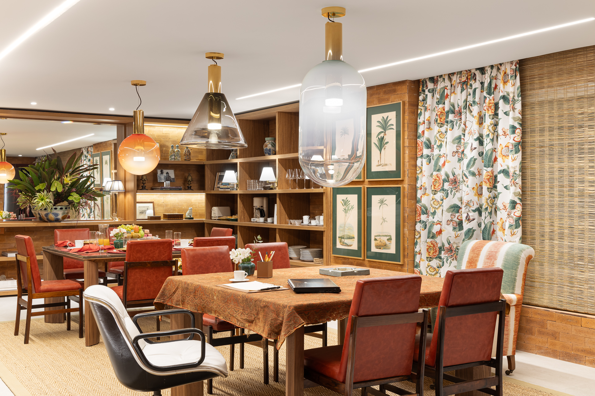 O projeto de Rosa May Sampaio é um exemplo de como a elegância e a praticidade podem se unir para criar um ambiente dos sonhos. O teto rebaixado, a iluminação estratégica, as mesas de jantar da coleção Himalaya da Clami, as cadeiras estilo anos 60 do Thomaz Saavedra, o piso em porcelanato da Portinari, as paredes de tijolos aparentes da Palimanan, as prateleiras em madeira louro freijó da Woodwork, as persianas feitas à mão, as cortinas estampadas da Print´s, a obra “Enquanto Conversava com Gustav 1” de Dudu Garcia e as gravuras indígenas do acervo da própria arquiteta são apenas alguns dos detalhes que tornam este ambiente único e especial.