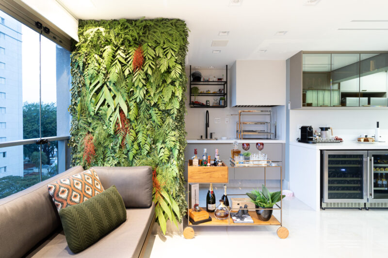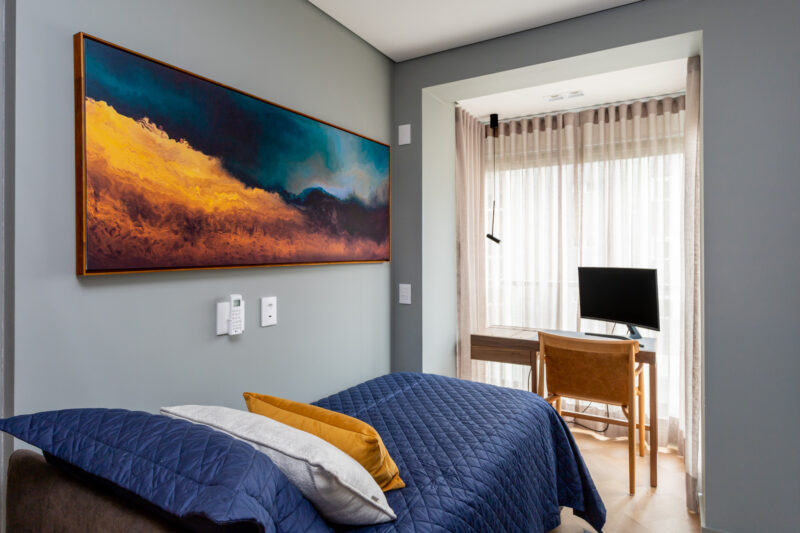 Desde a área social, com sala integrada e cozinha espaçosa, até a parte íntima, tudo, definitivamente tudo foi pensado para promover o máximo de conforto e bem-estar. “Eles vieram com várias ideias inovadoras e nos deram total liberdade para criar. Começamos o projeto do zero e levamos em conta o pedido de cada membro da família”, conta Bruna.