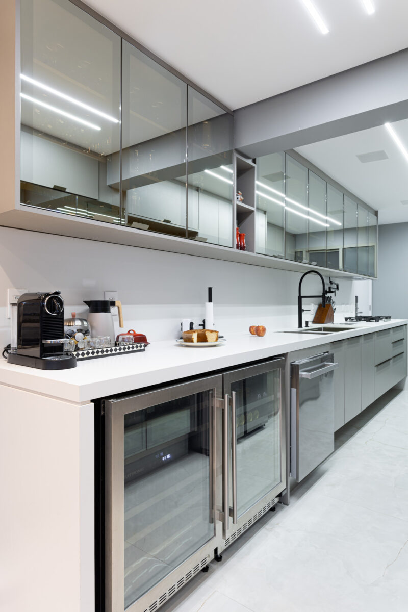 A cozinha está ao lado da sala de estar para atender às demandas da proprietária. Super equipada e prática, o destaque fica por conta de soluções que facilitam a rotina da família. A torneira de parede retrátil foi um dos pedidos da moradora, que tem um dia a dia muito agitado e precisa de rapidez no preparo dos alimentos. Prática, a torneira despeja a água diretamente sobre as panelas no fogão.