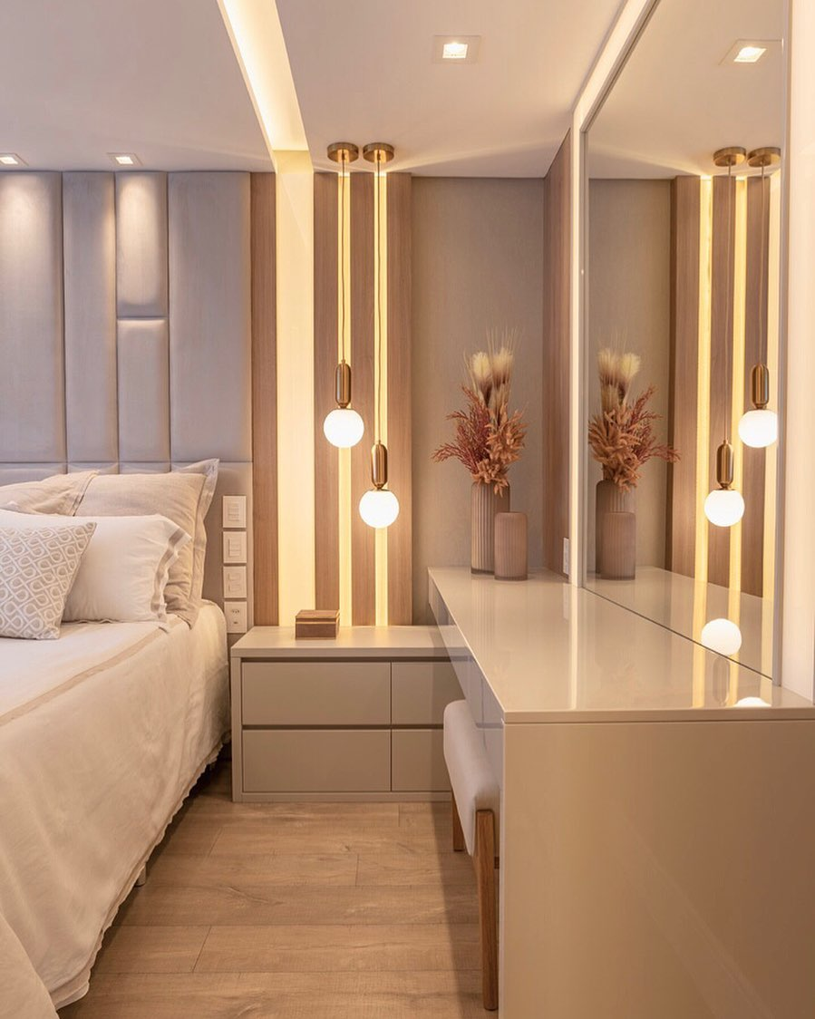 Para esse quarto, Renata Mossena projetou de acordo com a personalidade de cada morador. Para essa suíte do casal, ela seguiu uma linha mais clássica. Os detalhes na iluminação também foram pontos fortes do projeto, bem como o uso de materiais como laca, madeira, espelhos, detalhes em dourado e diferentes texturas trazidas através de tecidos e papéis de parede, trazendo aconchego ao ambiente.