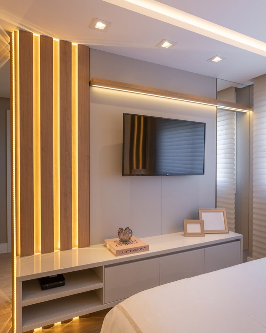 Quarto de casal com o máximo de armários embutidos e iluminação indireta. O projeto escolhido por nossa equipe aproveita o espaço ao máximo e cria um ambiente aconchegante.