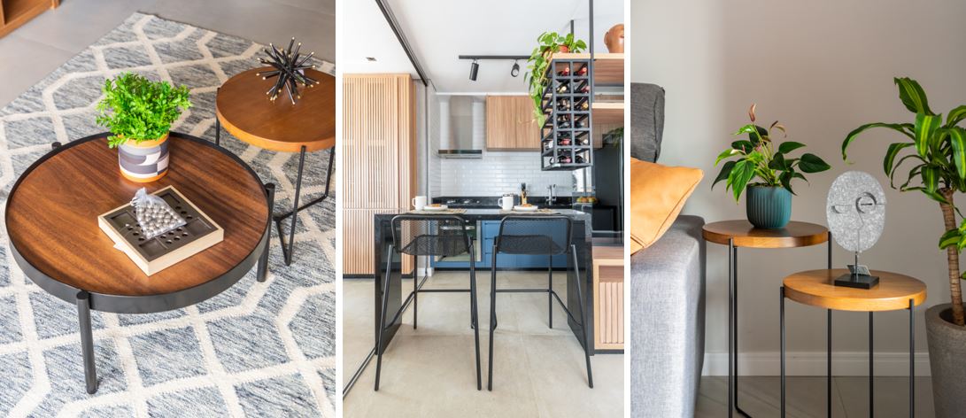 O metal também aparece em mesas, bancos, cadeiras e aparadores. Contrastando ferro e madeira, as peças ganham presença e personalidade. A serralheria permite criação de móveis exclusivos, sob medidas específicas, reforçando o estilo contemporâneo dos espaços.