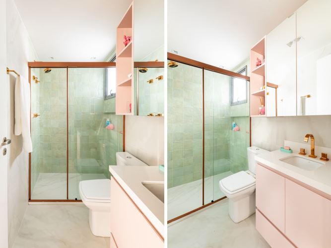 Embora o preto fosco seja um clássico, os metais ganharam versões coloridas por meio de pintura eletrostática. Tons como rose, verde, azul e dourado transformam o visual das peças e adicionam charme, irreverência e identidade ao projeto. “A cor muda completamente a percepção do metal”, afirma o arquiteto.