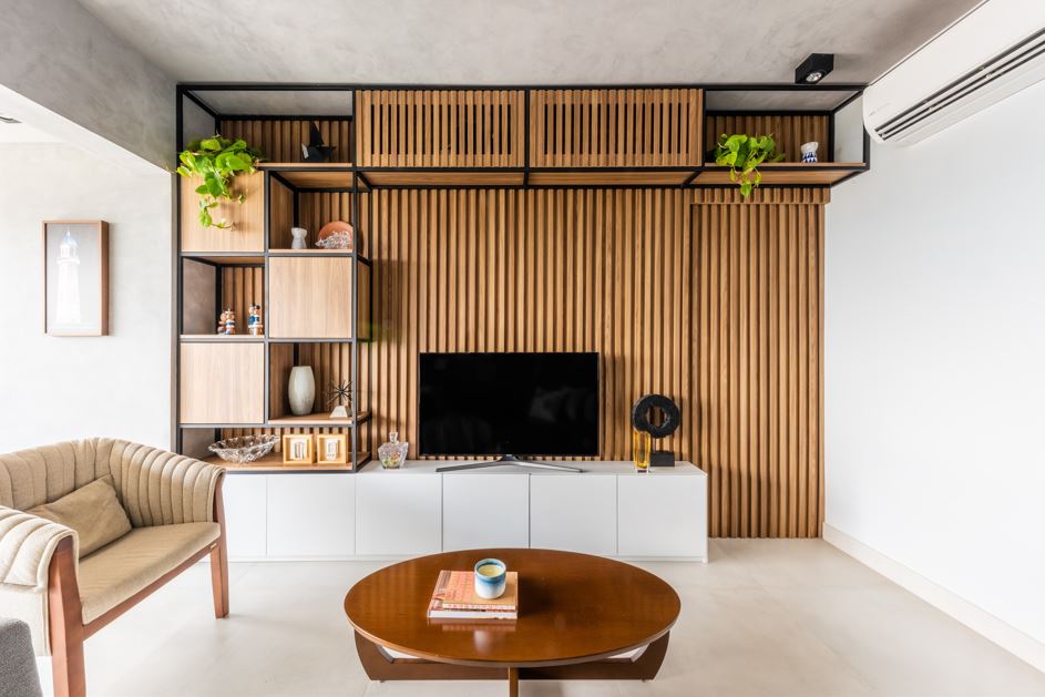 O encontro entre ferro e madeira resulta em estantes com linhas geométricas, textura e personalidade. Enquanto o metal oferece sustentação e leveza visual, a madeira amplia o aconchego e a customização. Essa dupla aparece em salas, cozinhas e dormitórios, com nichos aéreos, painéis ripados e composições sob medida que equilibram resistência e estética.