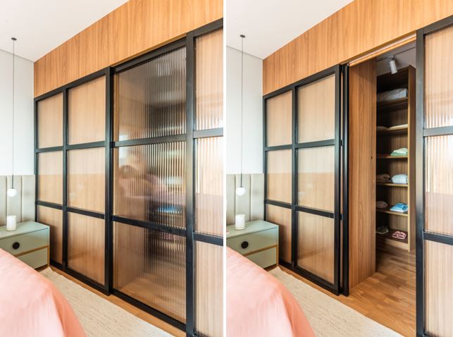 Portas metálicas com vidro canelado ou texturizado dão charme contemporâneo a closets, salas e home offices. Versáteis e funcionais, valorizam a circulação, trazem privacidade na medida certa e adicionam um toque retrô.