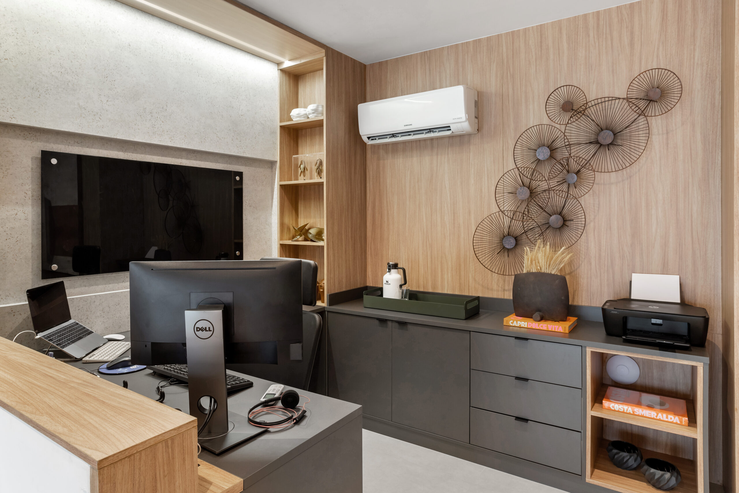 Mesas, painéis e pórticos combinam tons de madeira, pedra e cinza, criando um ambiente elegante e funcional.