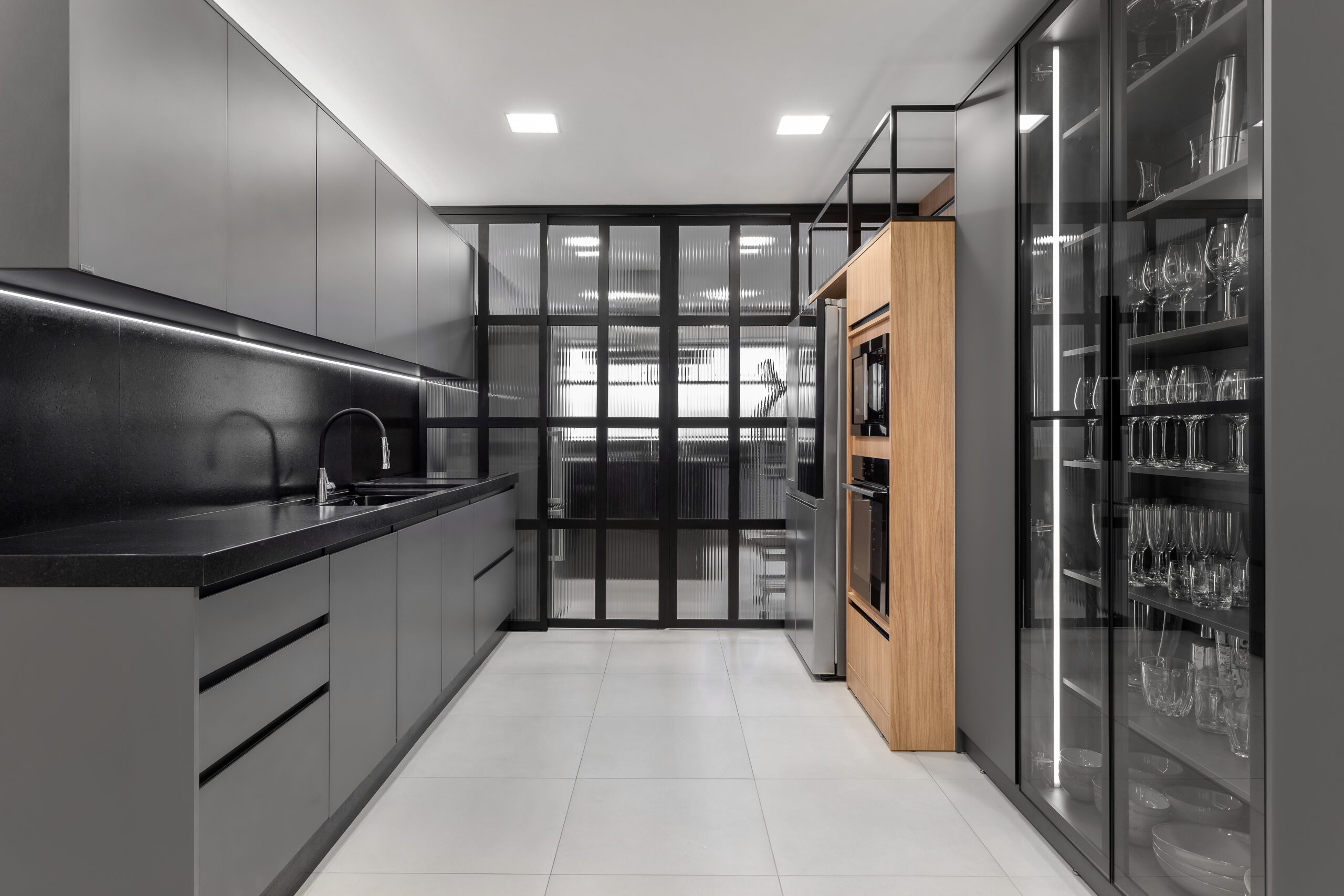 Um toque de glamour! A cristaleira com vidro transparente e iluminação LED rouba a cena. A torre em Cumaru abriga eletrodomésticos embutidos, contrastando com os tons de cinza que dominam o ambiente, como o topo em estrutura Metallo preto e armários em Volcano.