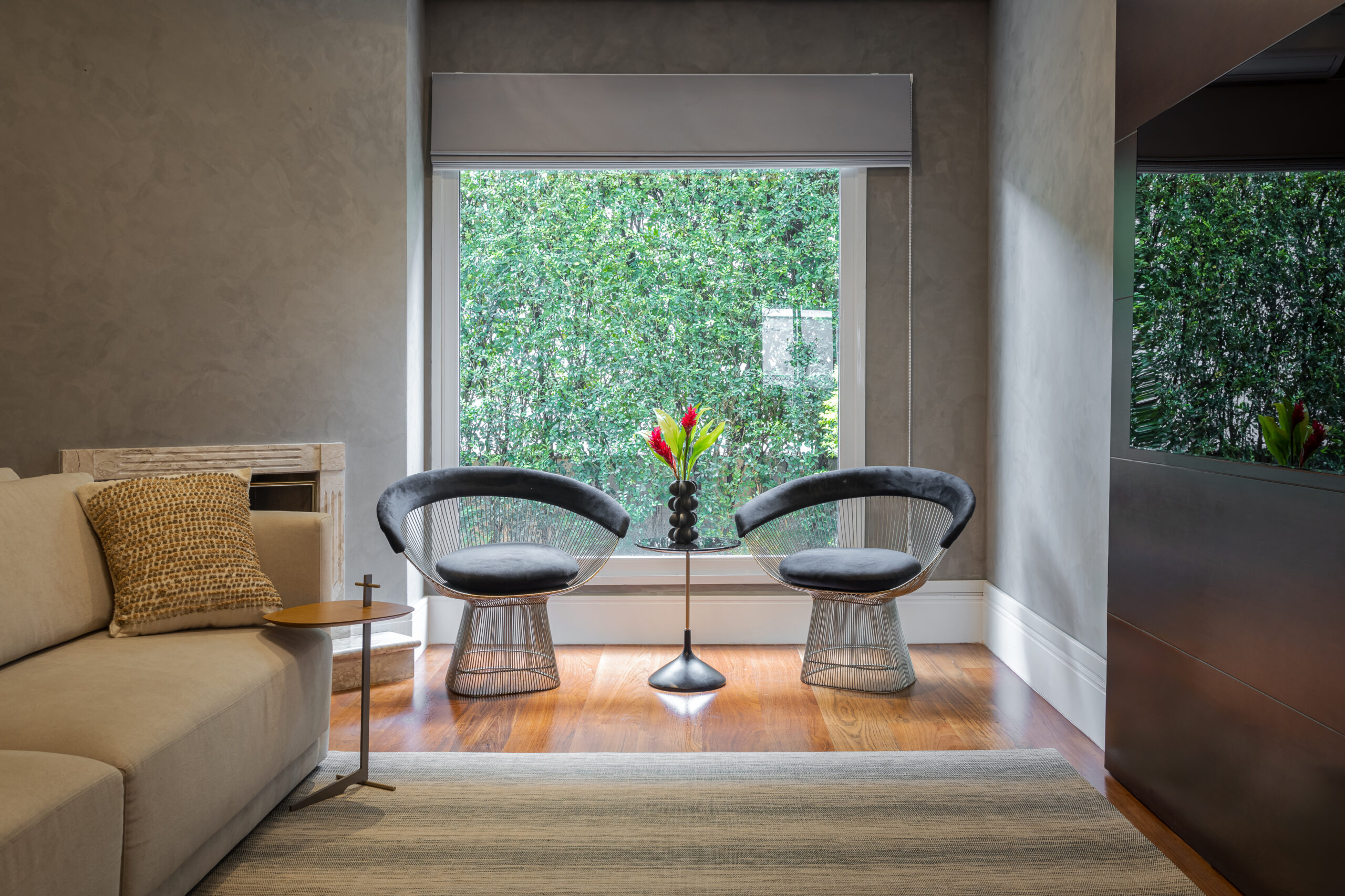 • Banheiro master: Um verdadeiro spa particular, o banheiro master conta com banheira de imersão, ducha dupla e área de relaxamento com vista para o jardim. O uso de mármore e metais dourados cria uma atmosfera luxuosa e relaxante.