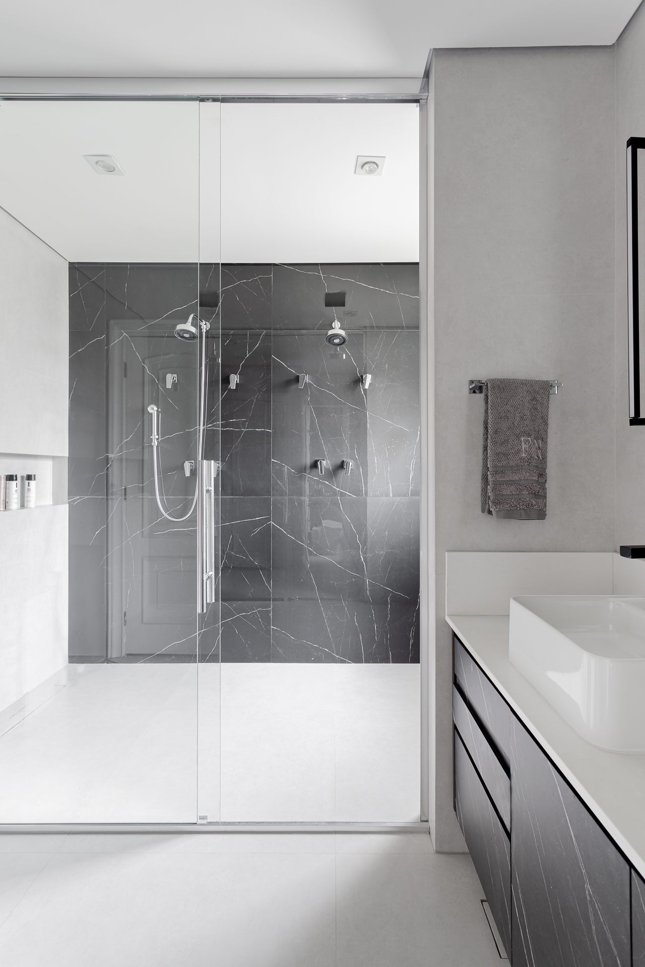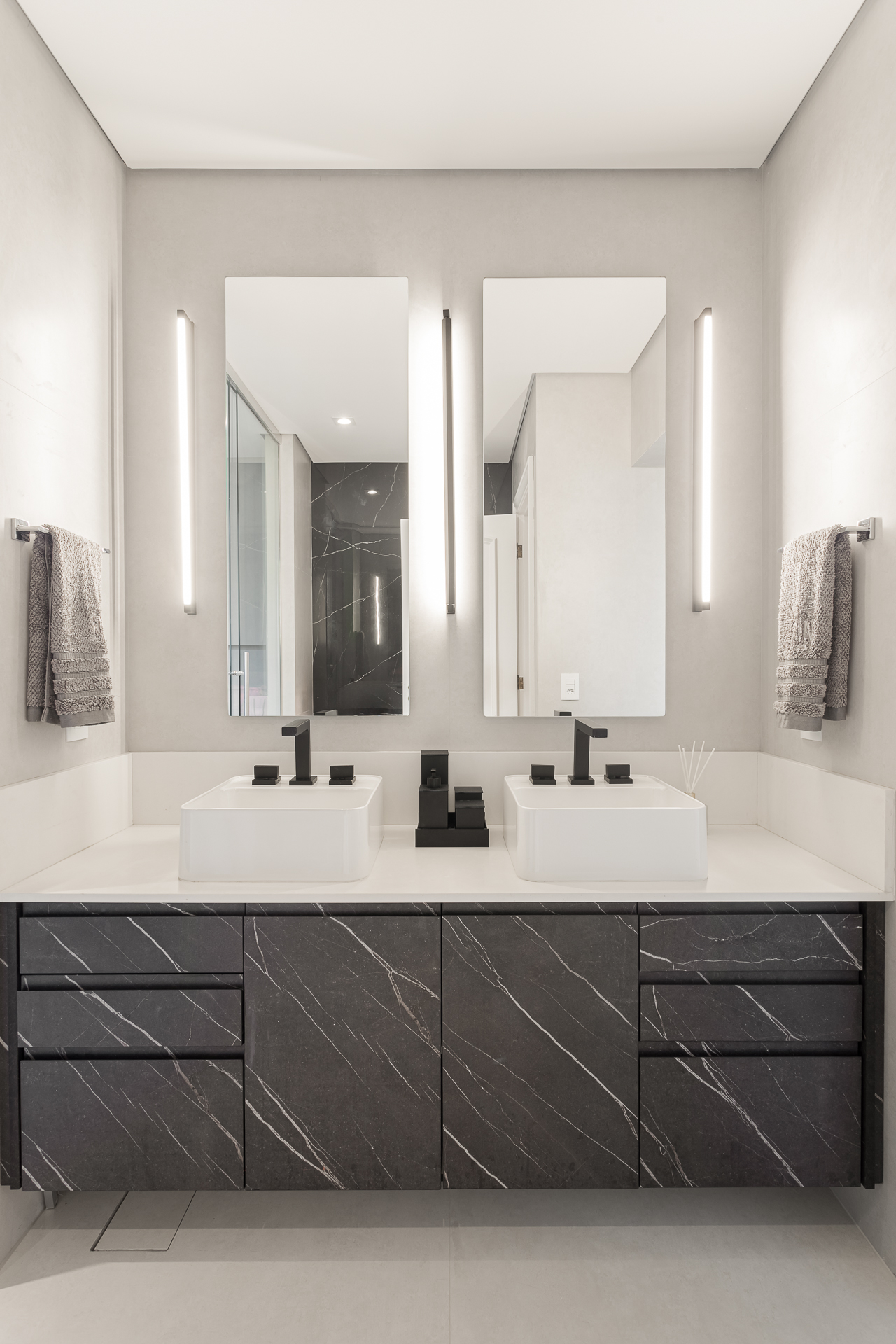 A reforma, que começou com o banheiro social, se expandiu para o closet, banheiro master e área social. Haline Messias conta que o projeto foi desenvolvido em estreita colaboração com Natalia, para garantir que cada detalhe atendesse às suas expectativas.
