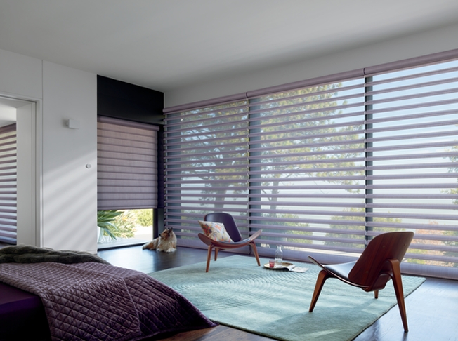 ● Cortina Silhouette: Com lâminas em forma de “S” entre véus transparentes de 100% poliéster, a Silhouette® oferece visibilidade exterior quando aberta e