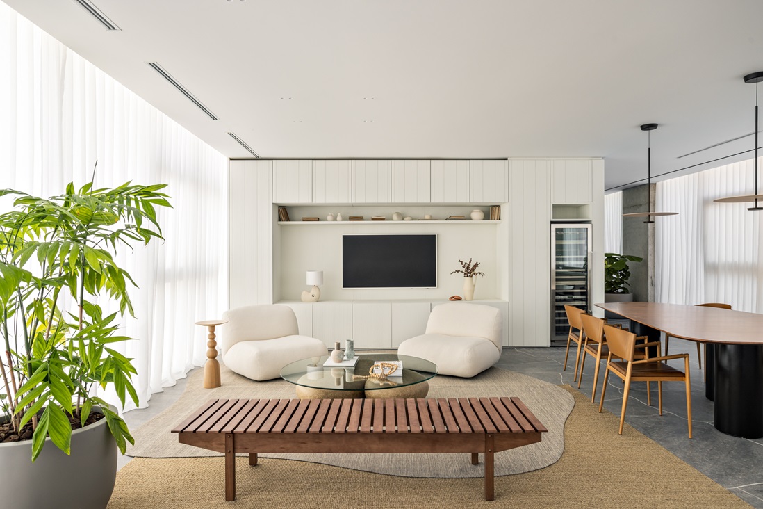 “Dentro da nossa proposta de decoração, traduzimos esse universo náutico, o mar, e trazer cores, materiais curvos e assimétricos, que geram fluidez por meio das linhas orgânicas”, afirma o designer de interiores Raphaell Valença.