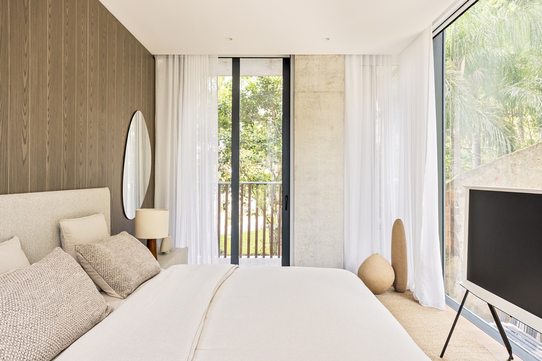 “O prédio está localizado entre águas, a mata e as montanhas e perto de uma das principais marinas do país, então desenvolvemos um estudo para criar piscinas com vidro e lajes inclinadas em frente a todos os apartamentos gerando essa ligação com o horizonte”, explica o arquiteto Greg Bousquet, fundador da Architects Office.