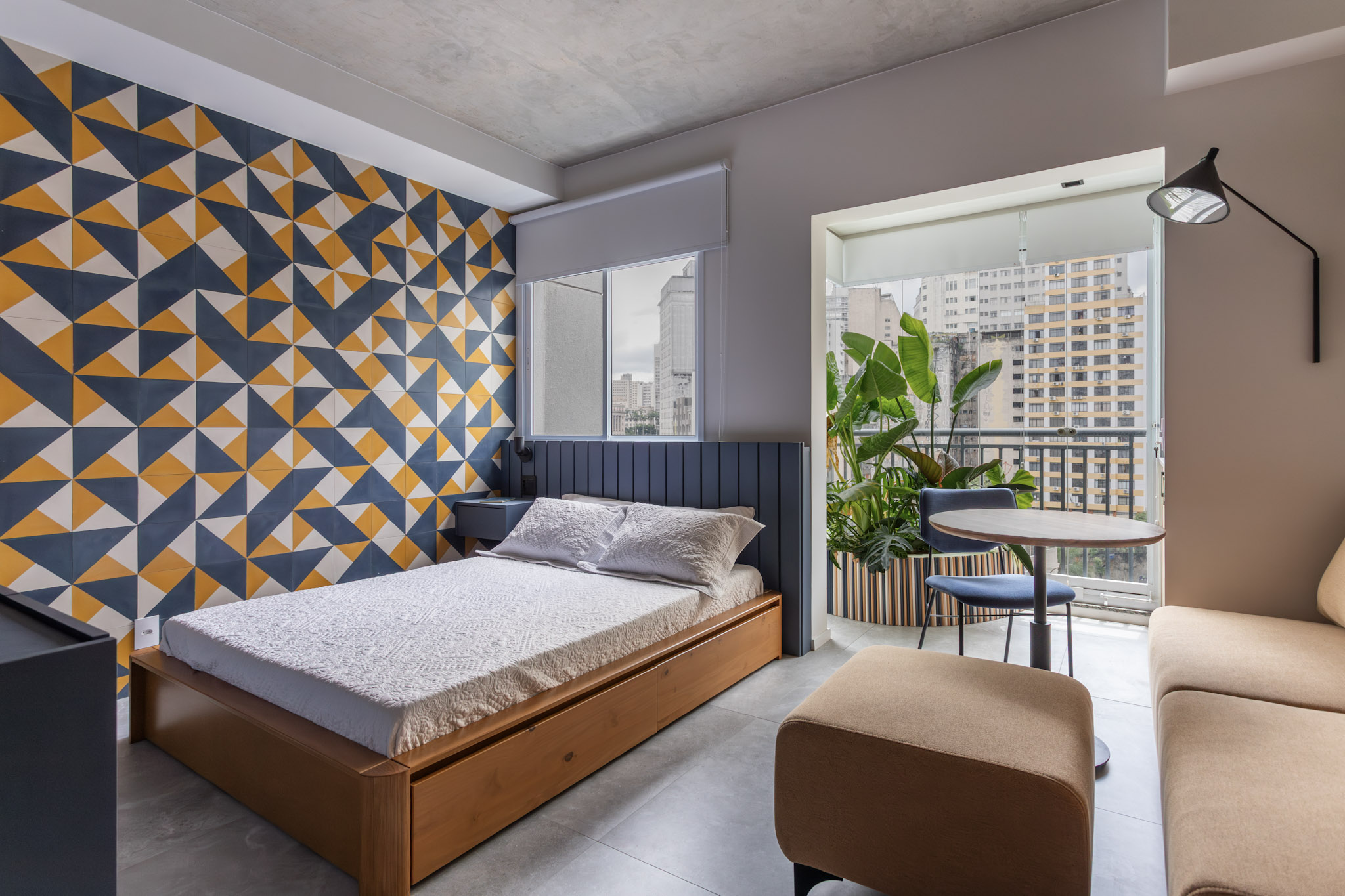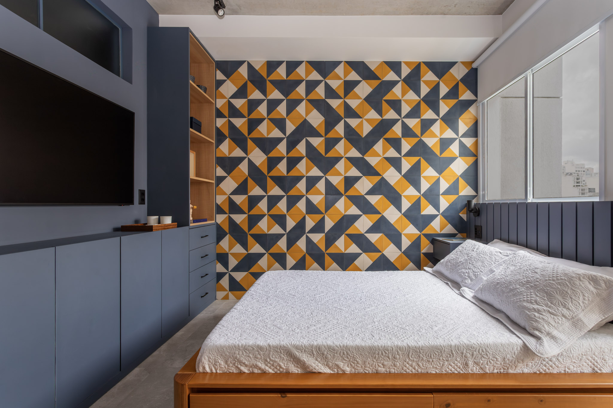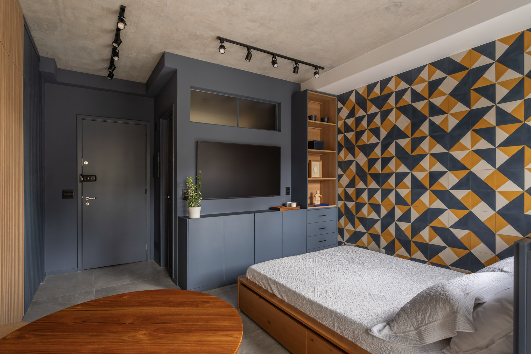 Outro destaque é o uso estratégico de revestimentos para criar identidade visual. O ladrilho hidráulico em tons de azul, off-white e mostarda aparece como elemento protagonista, marcando a parede principal e se estendendo ao banheiro, onde também cumpre função técnica ao proteger contra a umidade. A iluminação indireta e a entrada de luz natural, mesmo em um espaço sem janela convencional, demonstram o cuidado com o conforto do usuário.