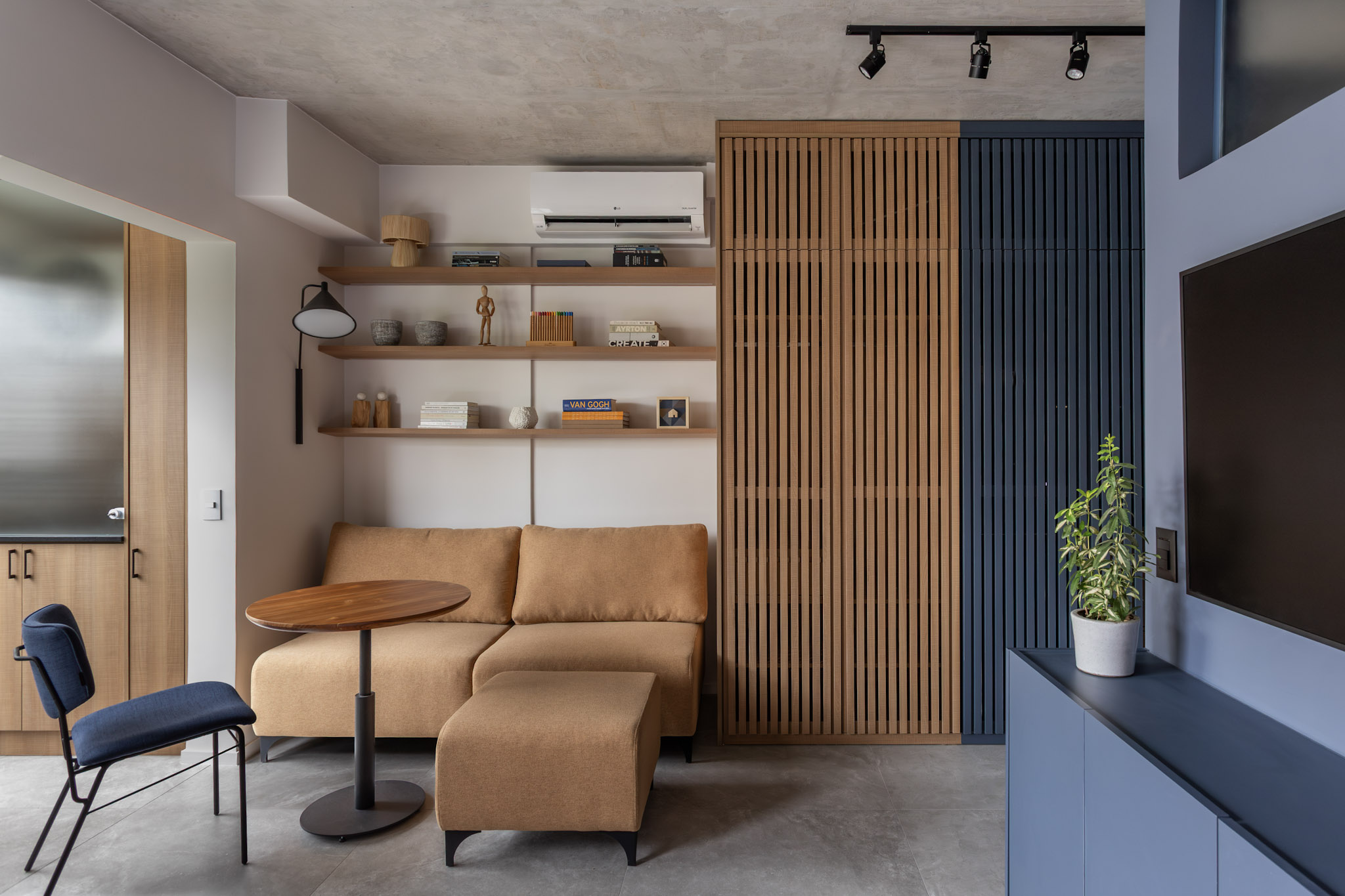 A proposta parte de uma paleta moderna e marcante, que combina azul-marinho, off-white, tons terrosos e toques de mostarda. O resultado é um ambiente visualmente impactante, mas equilibrado, que foge do padrão neutro e genérico comum em studios urbanos. A integração dos ambientes é um dos pilares do projeto, garantindo fluidez e amplitude em uma metragem reduzida.