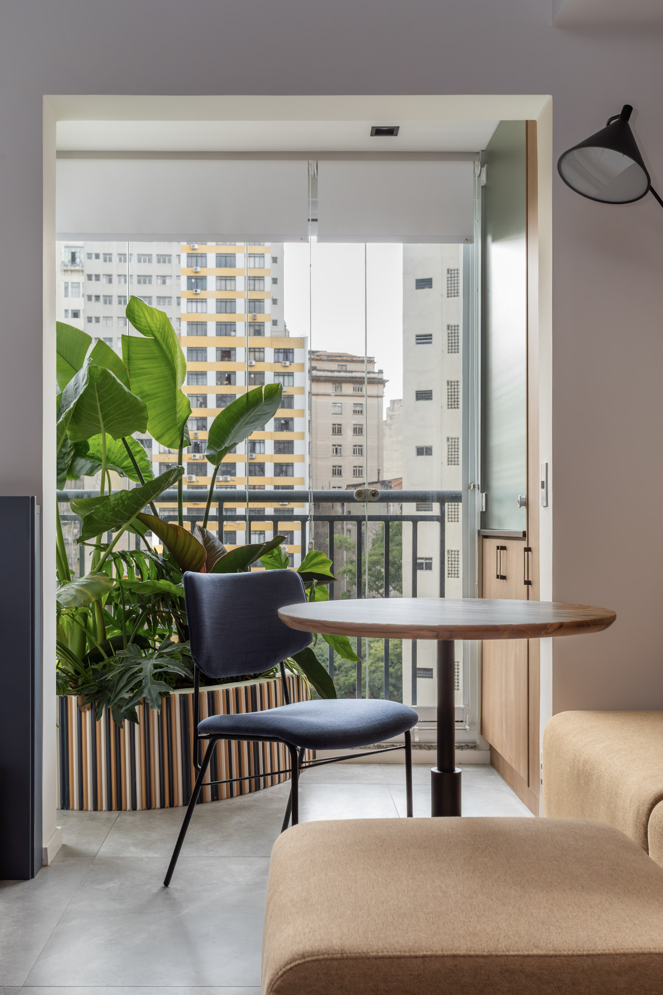 A varanda, muitas vezes subestimada em studios compactos, ganha protagonismo ao ser transformada em uma extensão acolhedora do living. Com mobiliário sob medida e uma pequena jardineira, o espaço reforça a sensação de “casa” — atributo cada vez mais valorizado por hóspedes de curta temporada.
