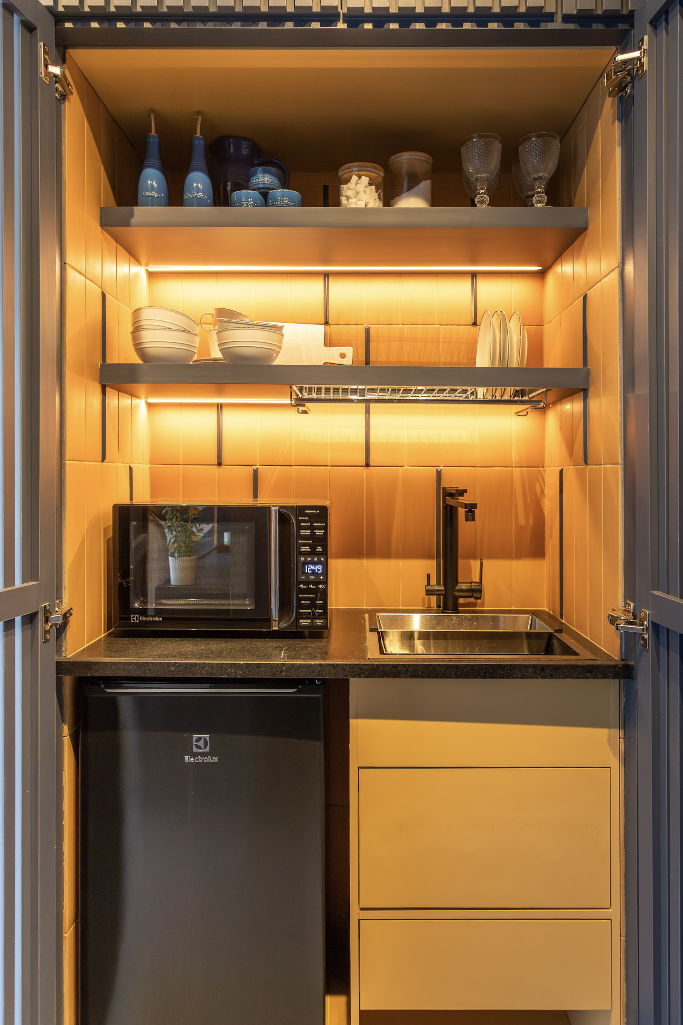 A marcenaria sob medida desempenha papel central na organização do espaço. Dividida em diferentes acabamentos de MDF, ela abriga funções essenciais como guarda-roupa e uma mini-copa completa, equipada com frigobar, micro-ondas e pia. O uso do granito preto São Gabriel e a iluminação em LED de 2700K reforçam a atmosfera acolhedora, ao mesmo tempo em que elevam o padrão estético do imóvel.