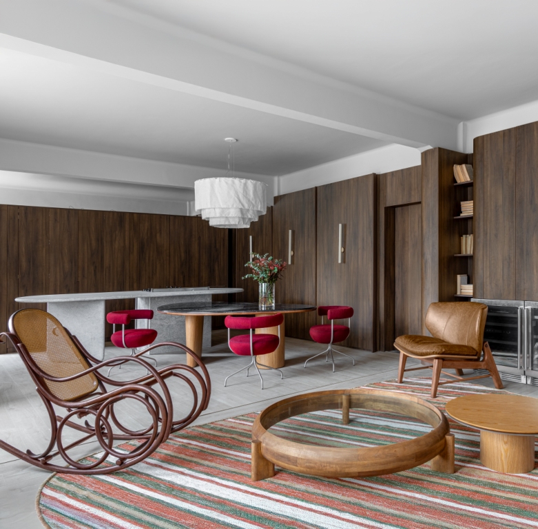 O arquiteto Gustavo Pigatto idealizou um espaço que celebra o alvorecer, um novo começo. Em 90 m², a marcenaria inteligente define os ambientes de forma fluida, integrando a cozinha que pode ser sutilmente oculta. A paleta de cores equilibra tons de bege, off-white, linho, travertino, terracota e borgonha, contrastando com a madeira escura. O estilo navega entre a atemporalidade do mid-century e a sofisticação discreta do quiet luxury.