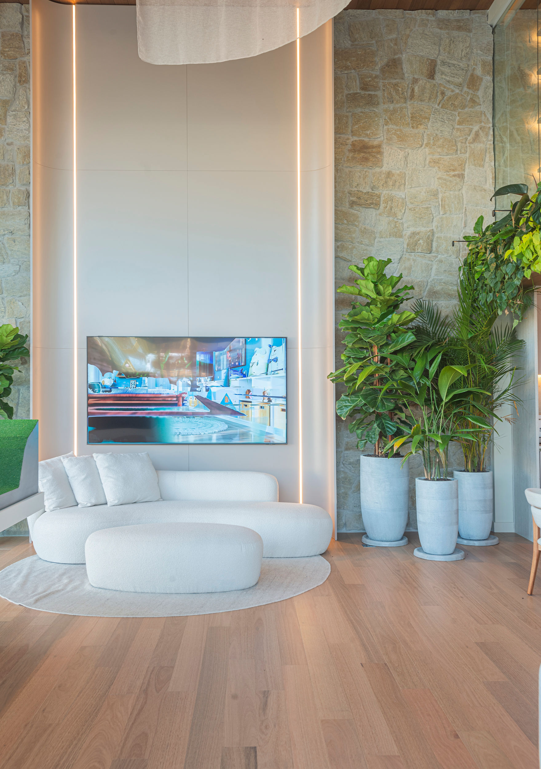 A escolha por materiais naturais não foi por acaso. A arquiteta explica que a intenção era criar um ambiente que proporcionasse uma experiência sensorial única, conectando os visitantes à natureza e ao mar. “Optamos por tons mais claros e revestimentos genuínos, como pedra moledo e pisos e teto em madeira, além de integrar a biofilia, trazendo o verde para dentro do ambiente”, detalha Maria Fernanda.