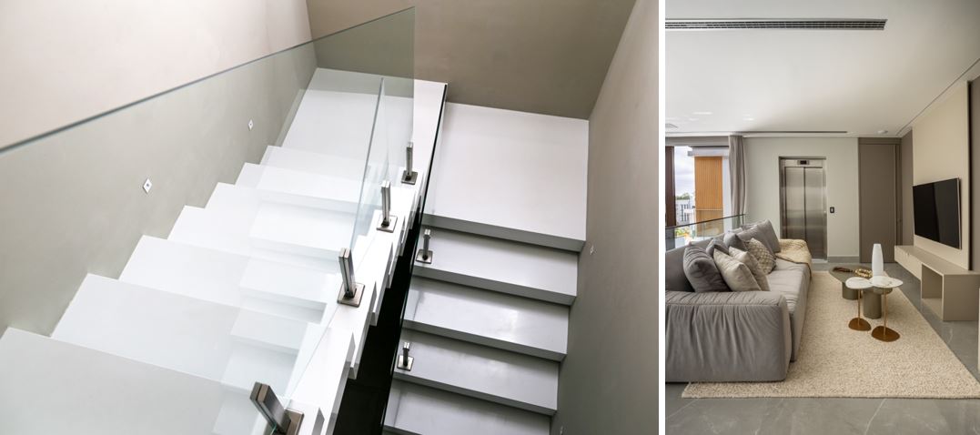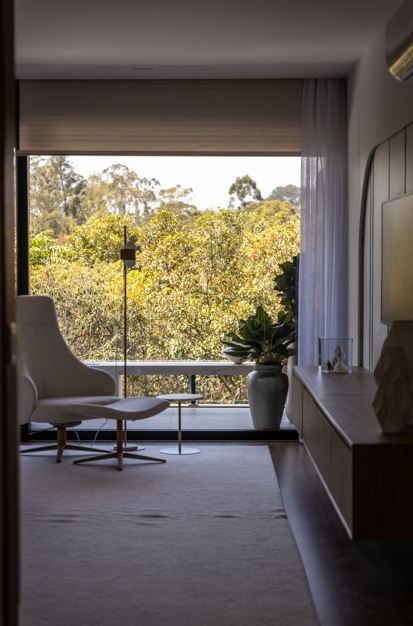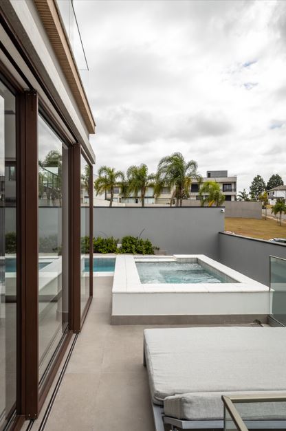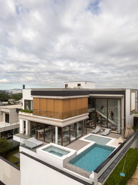 Já nos terrenos em declive, o projeto acompanha o caimento natural do lote. Essa característica permite a criação de pavimentos inferiores plenamente utilizáveis — algo inviável em terrenos planos — e amplia as possibilidades de integração entre arquitetura, paisagismo e áreas de lazer. “O declive convida o projeto a seguir o relevo, reduzindo intervenções agressivas e criando soluções mais eficientes do ponto de vista estrutural e espacial”, reforça Mariana.