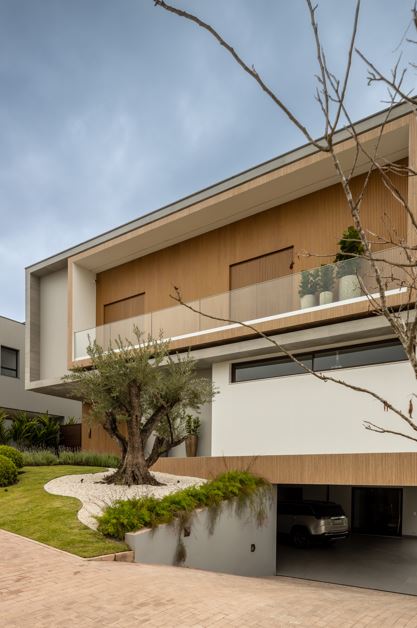 Em terrenos inclinados, a garagem subterrânea surge como uma solução estratégica. Além de otimizar o uso do lote, ela contribui para fachadas mais limpas e valorizadas, já que evita que grandes áreas sejam ocupadas por vagas aparentes. Em terrenos em declive, essa solução acontece de forma quase natural; em aclives, pode reforçar a verticalidade da construção, desde que respeitadas as normas do condomínio ou da legislação local.