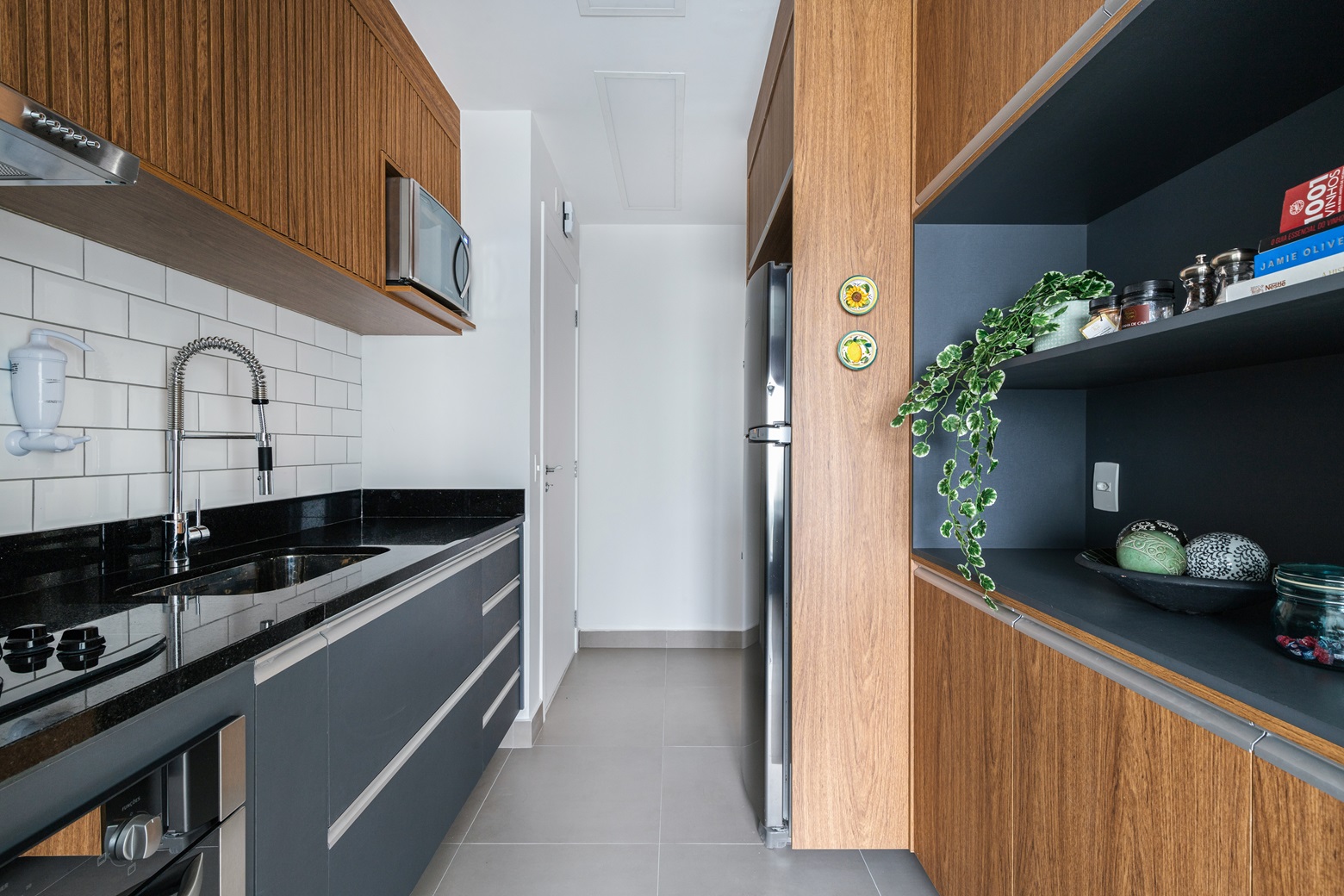 A escolha dos materiais foi fundamental para criar uma atmosfera aconchegante e sofisticada. O porcelanato cinza, presente nas áreas principais, contrasta com o painel floral do living, adicionando personalidade ao ambiente. Na cozinha, o porcelanato amadeirado e os armários escuros criam um visual elegante e atemporal. A marcenaria em madeira, por sua vez, conecta os ambientes e traz aconchego.