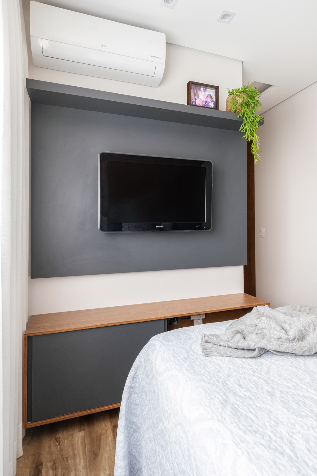 Cada ambiente foi pensado para atender às necessidades dos moradores. No quarto infantil, o design lúdico e evolutivo garante um espaço que acompanhará o crescimento da criança. O dormitório master, por sua vez, é um refúgio de tranquilidade, com uma cabeceira estofada integrada ao painel de TV e iluminação moderna. Os banheiros, com suas soluções práticas e elegantes, completam o projeto.