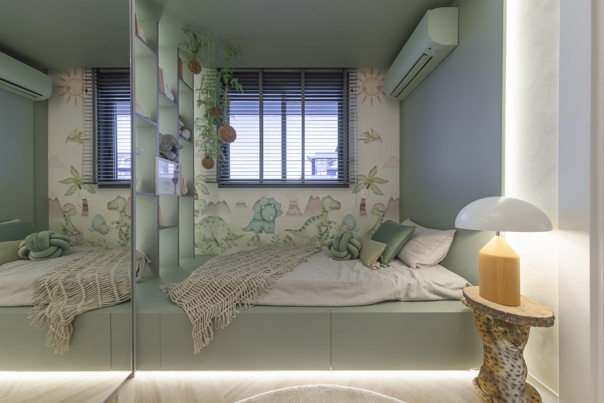 • O papel de parede minimalista com estampa de dinossauro estimula a criatividade sem sobrecarregar o ambiente.
