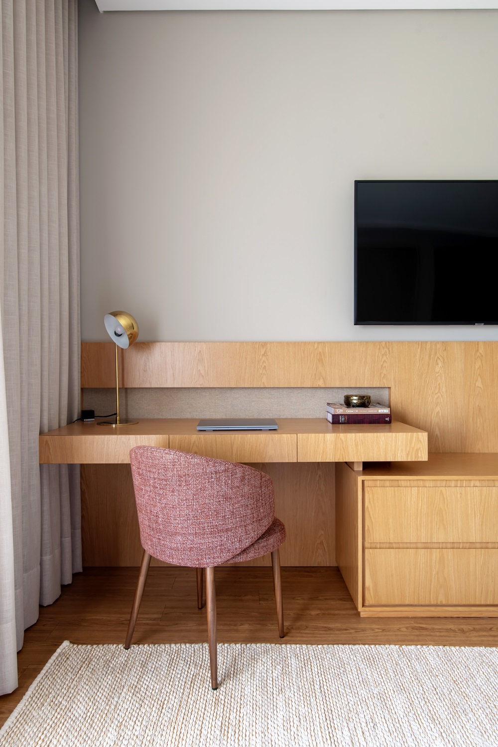 - Detalhes que fazem a diferença: Um tapete sob a mesa, almofadas confortáveis na cadeira e uma luminária de mesa charmosa podem elevar o visual do seu Home Office.