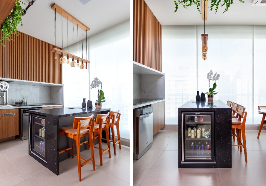 • Varanda gourmet completa: Com churrasqueira embutida, cooktop, cervejeira e um painel ripado que valoriza o pé-direito, a varanda se tornou o coração da casa, perfeita para receber amigos e família.