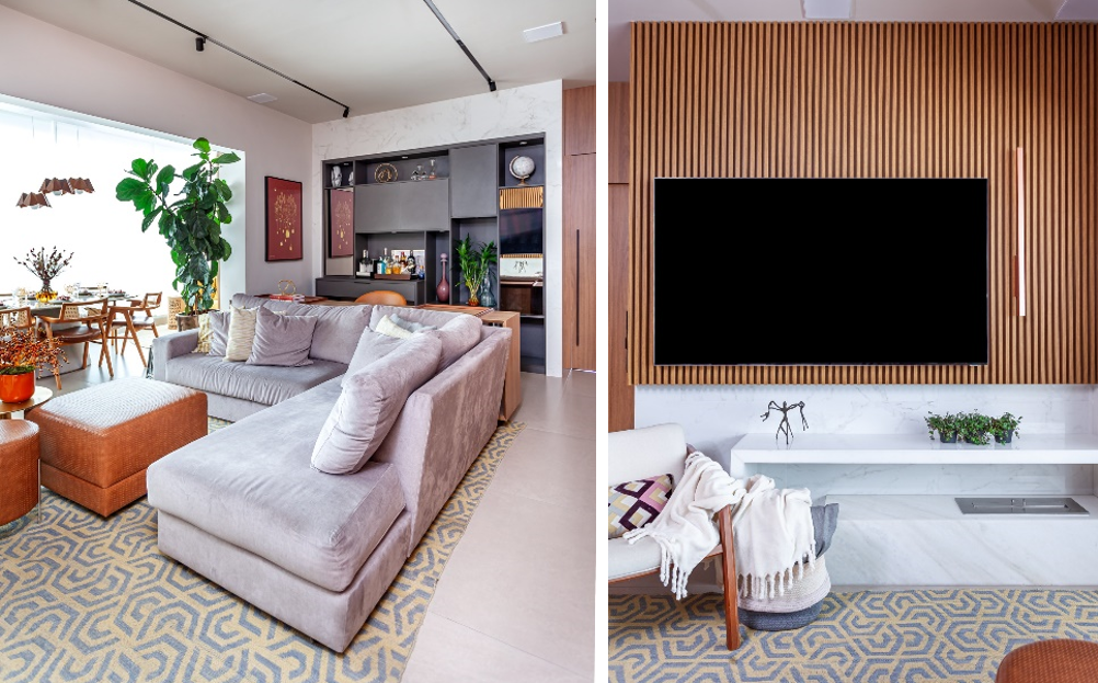 • Ambientes integrados: A retirada da parede que separava a sala da varanda proporcionou um espaço mais amplo e integrado, perfeito para a convivência familiar.