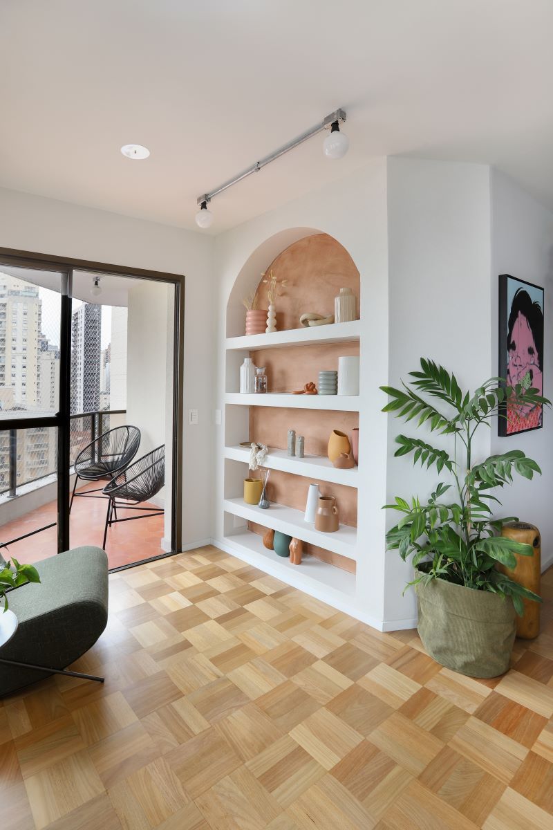 Com certeza, você terá a sensação de já ter visto essa cor antes em algum decor por ai. Neste projeto o Studio 92 Arquitetura (@studio_92arquitetura) destaca a parede dos nichos da estante esculpida com a cor do ano esfumaçado transmitindo a mensagem de acolhimento e quietude. Foto: Mariana Orsi
